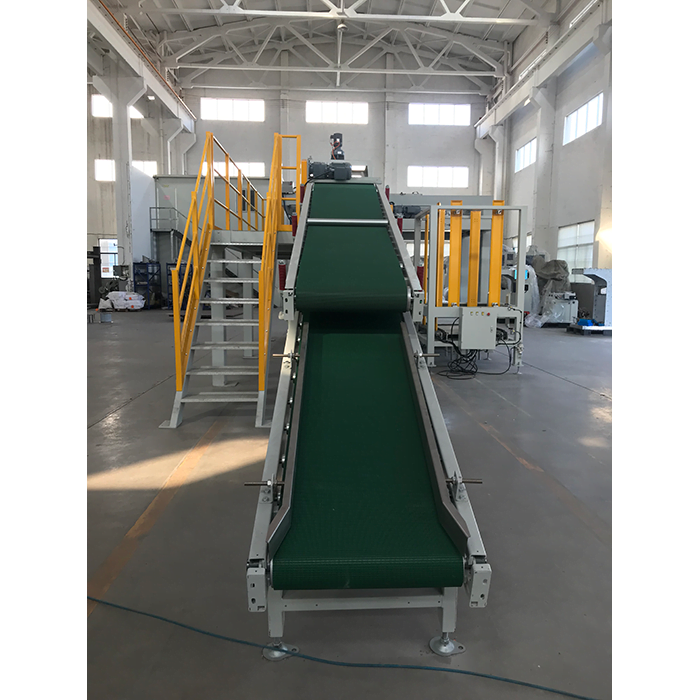 It consists of a belt conveyor and a stainless steel buffer plate. On the belt conveyor, the bags are grouped in a 3+2 or 2+3 type.